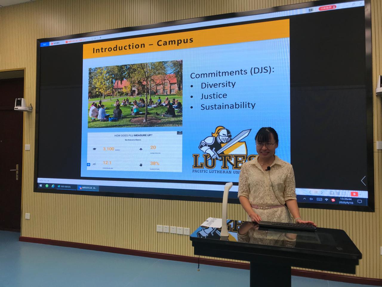 会上,刘娜就其在美国太平洋路德大学的访问、学习和体验与大家进行了分享。介绍了美国太平洋路德大学的学生情况,汇报了听课、参与研讨会和国际交流活动等日常学习活动,从学校的软硬件建设、学生的综合培养、美国大学课程设置特点等方面分享了体会。刘娜由2017年度教育系统省政府公派出国留学项目资助,于2019年3月-2020年8月在美国太平洋路德大学访问学习,访学期间积极参与学校的各类学术活动、观摩课堂教学并和太平洋路德大学商学院及教育学院的相关教授进行学术和教学探讨,拓展了国际视野,获益匪浅。访学期间,刘娜还参与了《汉语同音系列》三部书籍的翻译及编辑工作,为中美文化交流做出了积极努力。刘娜在访学后期经历了美国的新冠疫情,目睹了动荡的美国社会,但收到了来自我国驻美大使馆和学院的慰问关心并顺利回国,因此也真切地感受到日益强大的祖国是海外留学人员的坚强后盾。
