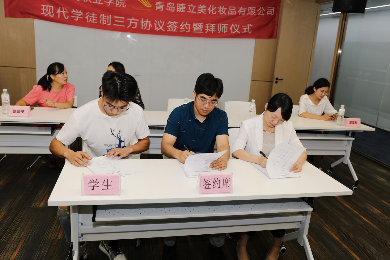 为深化产教融合,推进校企合作协同育人,8月31日,伟德国际victor1946官网国际贸易系与青岛睫立美化妆品有限公司举行现代学徒制三方协议签约暨拜师仪式。青岛睫立美化妆品有限公司董事长孙泗民、总经理李艳,国际贸易系部门负责人程炜杰、副主任张宗英,以及企业导师代表、校内导师代表,现代学徒制班级全体同学参加了仪式。
