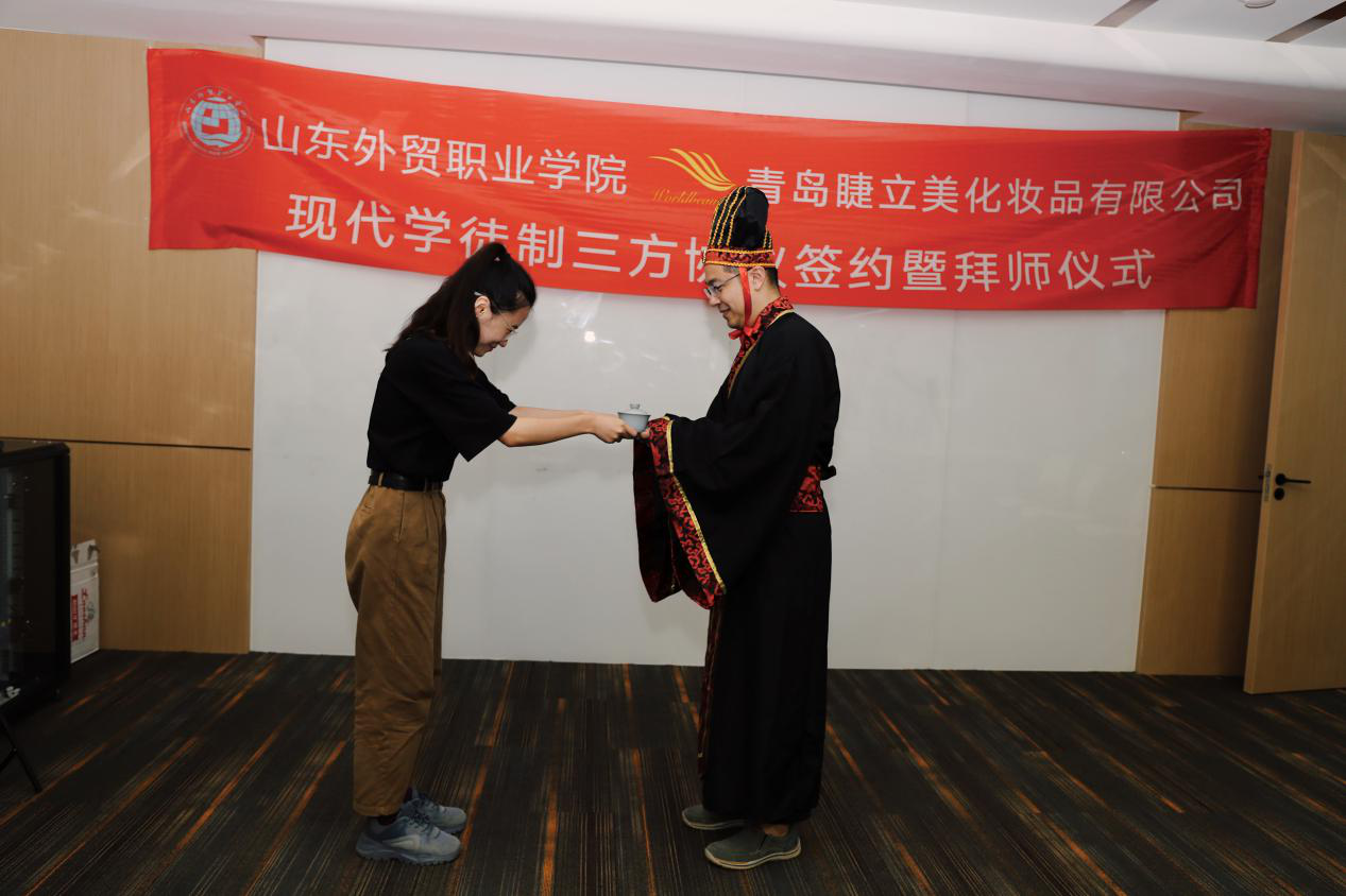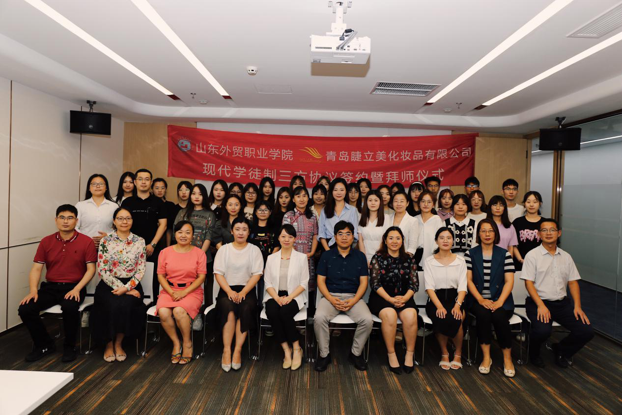 为深化产教融合,推进校企合作协同育人,8月31日,国际贸易系与青岛睫立美化妆品有限公司共同举行现代学徒制三方协议签约暨拜师仪式。青岛睫立美化妆品有限公司董事长孙泗民、总经理李艳,国际贸易系临时负责人程炜杰、副主任张宗英以及企业导师代表、校内导师代表、现代学徒制班级全体同学参加了仪式。