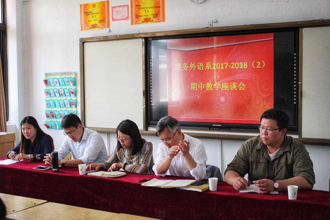 近日,商务外语系召开了三场2017-2018学年二学期期中教学座谈会,按专业分三天分别进行了座谈。学院副院长周厚才,商务外语系书记贾贵贞、主任王应喜,基础部和教务处负责人,相关专业教师、辅导员出席并参加座谈会,2016级、2017级学生代表分别参加了所属专业的座谈会。