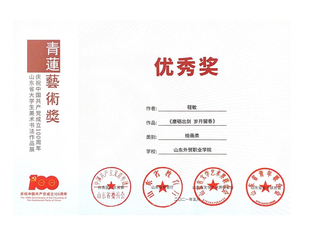 近日,由共青团山东省委、山东省教育厅、山东省文化和旅游厅、山东省文学艺术界联合会、山东省青年联合会等共同主办,齐鲁工业大学(山东省科学院)承办的山东青莲艺术奖·庆祝中国共产党成立100周年山东省大学生美术书法作品展评选结果揭晓,伟德19级国际金融1班学生程敏的作品《磨砺出剑 岁月留香》荣获绘画类优秀奖。
