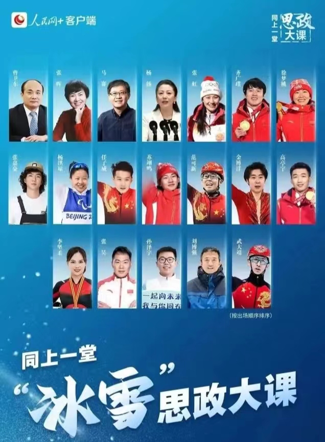 本次思政大课由教育部社会科学司、国家体育总局冬季运动管理中心、中共北京市委教育工作委员会指导,人民日报社体育部、人民网和北京体育大学联合主办。中国农业大学马克思主义学院院长张晖教授、清华大学美术学院党委书记马赛教授先后为大家讲授了“冬奥之路”“理论指导”“使命在肩”“奋斗有我”等内容,分别从不同的角度、不同的层面诠释着我国体育一路披荆斩棘取得的伟大历史成就、铸就的冬奥精神和对新时代广大青年的殷切期望。活动还邀请了杨扬、张虹、徐梦桃、苏翊鸣、武大靖、杨洪琼等13名冰雪名将以及标兵志愿者、制冰师、民间爱好者等冬奥参与者,为全国大学生共同讲述冬奥故事,展现运动员的奋斗拼搏以及冰雪运动的魅力。