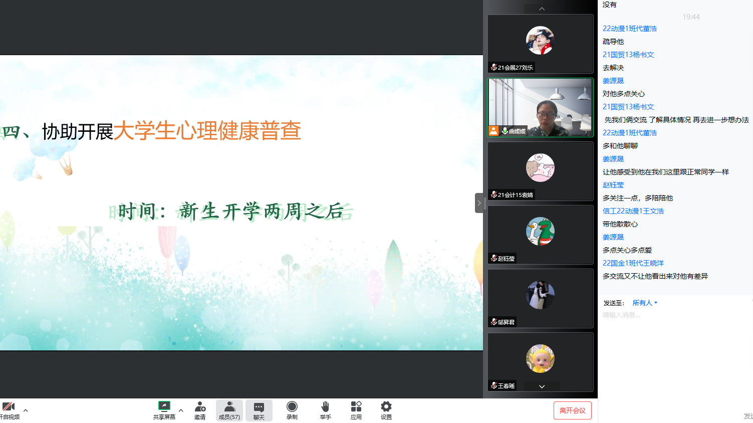 此次培训以线上方式进行,由心理咨询中心教师担任主讲。培训中,主讲人就新生班辅导员助理的职责与角色定位做了说明,明确了新生心理健康工作中各项内容及具体要求;对于班级心理工作中需重点关注的学生群体,主讲人提醒辅导员助理们要以积极热情、细致严谨的工作态度和专业的工作能力进行引导,帮助他们尽快适应大学生活。培训最后对新生班辅导员助理工作中的现有问题进行了一一解答。