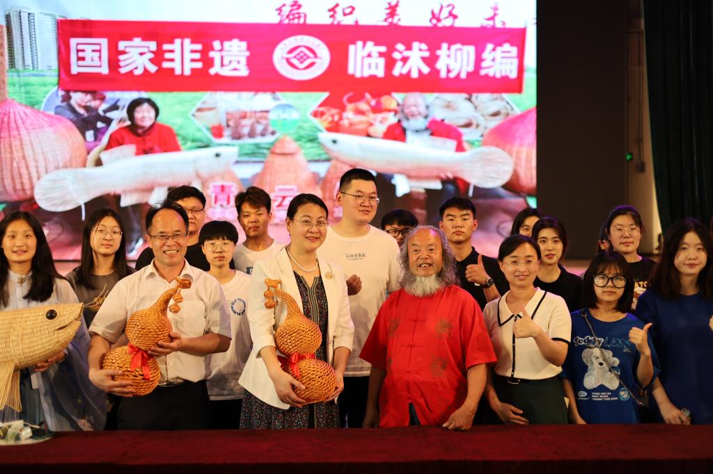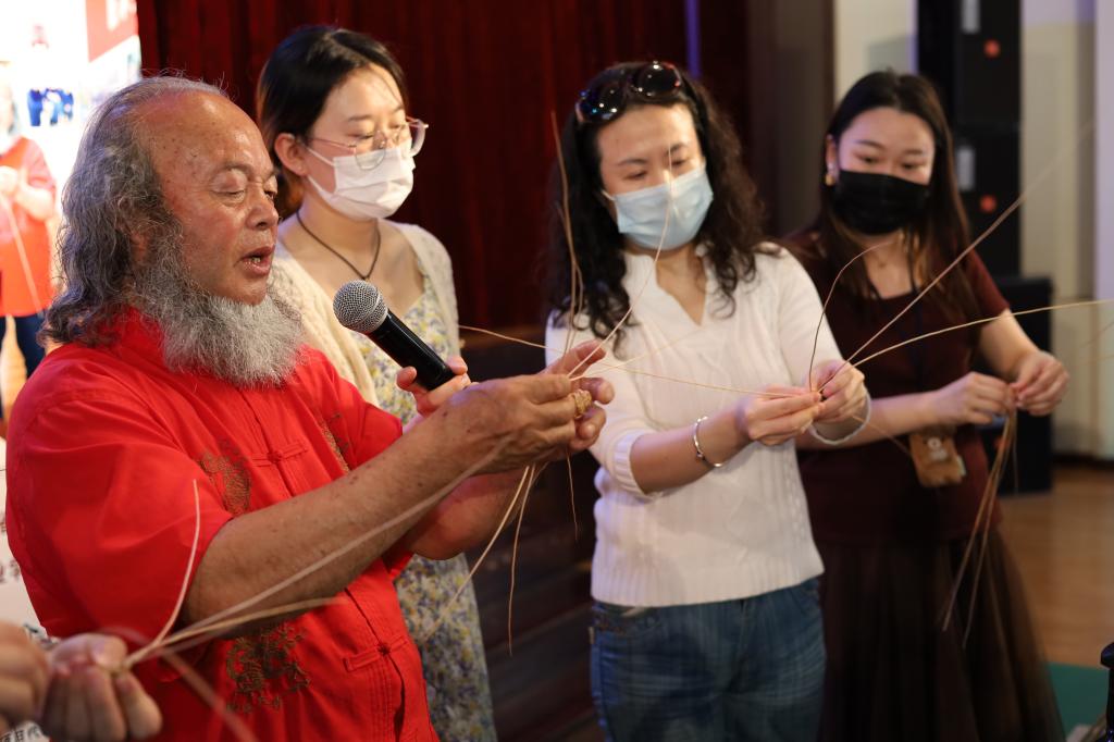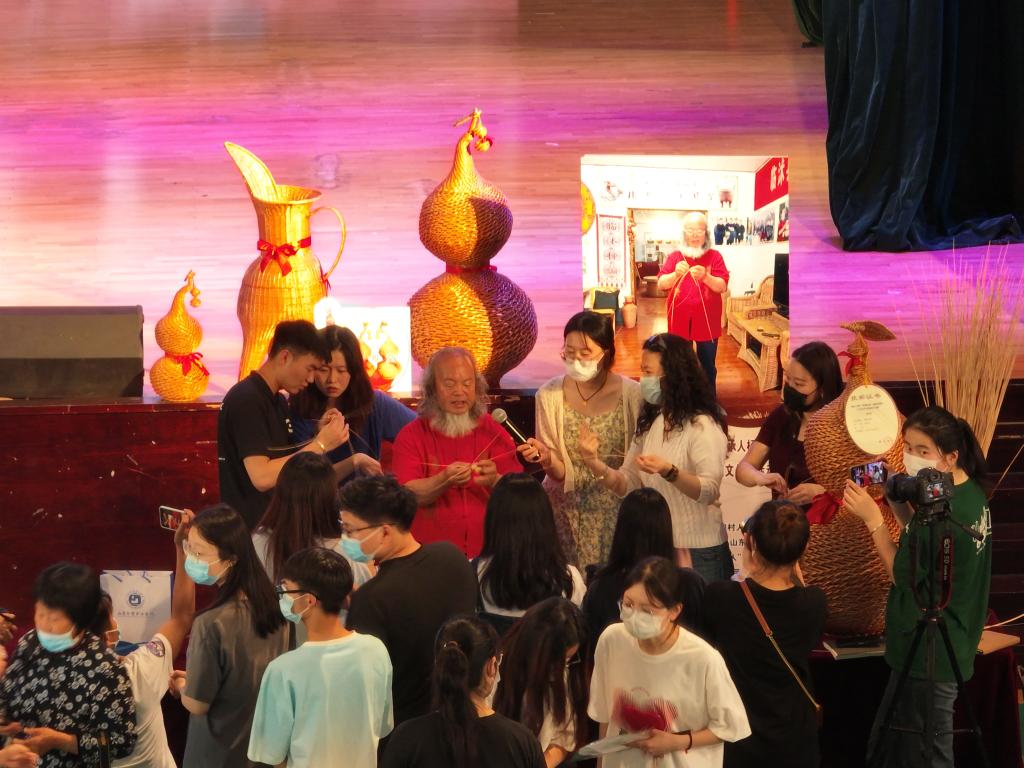 在非遗项目展示区,学院邀请到了省级劳动模范、国家级非遗项目——柳编的省级非遗代表性传承人杨进邦先生莅临现场,为现场师生讲解柳编原材料的选用、初处理工艺、编制技艺,同时现场制作柳编“葫芦”,为参与活动的师生展示了柳编技艺。并与现场师生就柳编工艺品出口等进行了沟通交流。