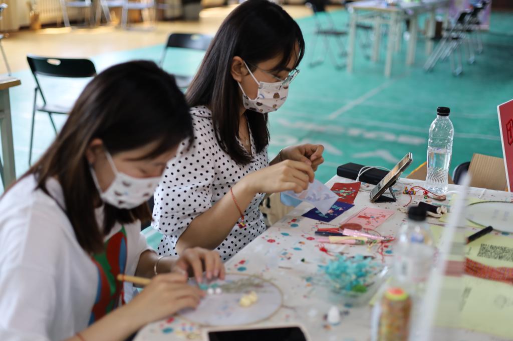 在粽子摊位上,老远便闻到了粽叶和江米的清香,在学院餐厅面点师傅们的指导下,师生们纷纷大展身手,在绳线缠绕间,一个个甜美的粽子便呈现在眼前。在团扇香囊摊位上,空气中弥漫着艾草的清香,学生们一针一线的认真缝制着香囊,在一穿一绕间,使得香囊上的玉珠清脆作响。