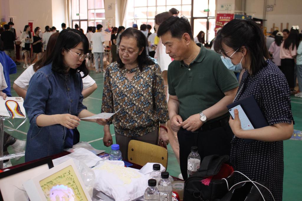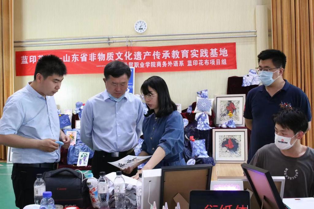 院省级非物质文化遗产教育传承基地项目蓝印花布项目区展出了蓝印花布床单、台布、抱枕、帽子、灯饰等制品。项目组成员为参观的师生就布料的选用、刻板、印染等工艺流程进行了讲解,并现场展示了刻板工艺。