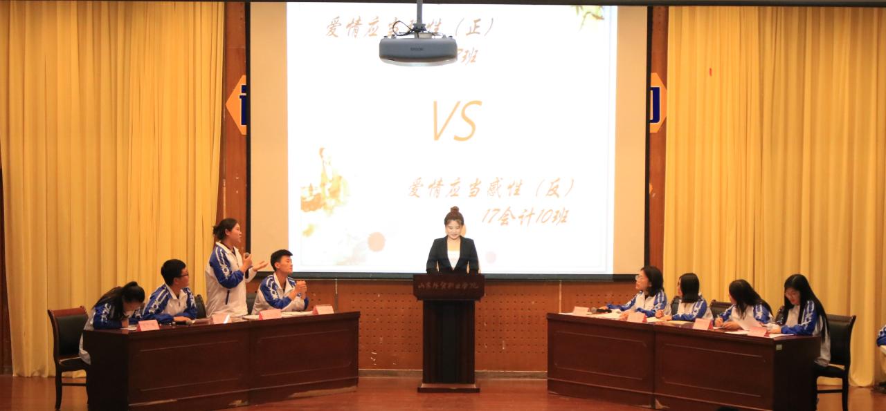 本次辩论赛的辩题围绕大学生恋爱展开,选取了“爱情应当理性还是感性”、“分手是种成长还是打击”、“分手能够体面还是无法体面”三个辩题,17会计5班、17会计7班、17会计10班代表队进行了循环辩论。