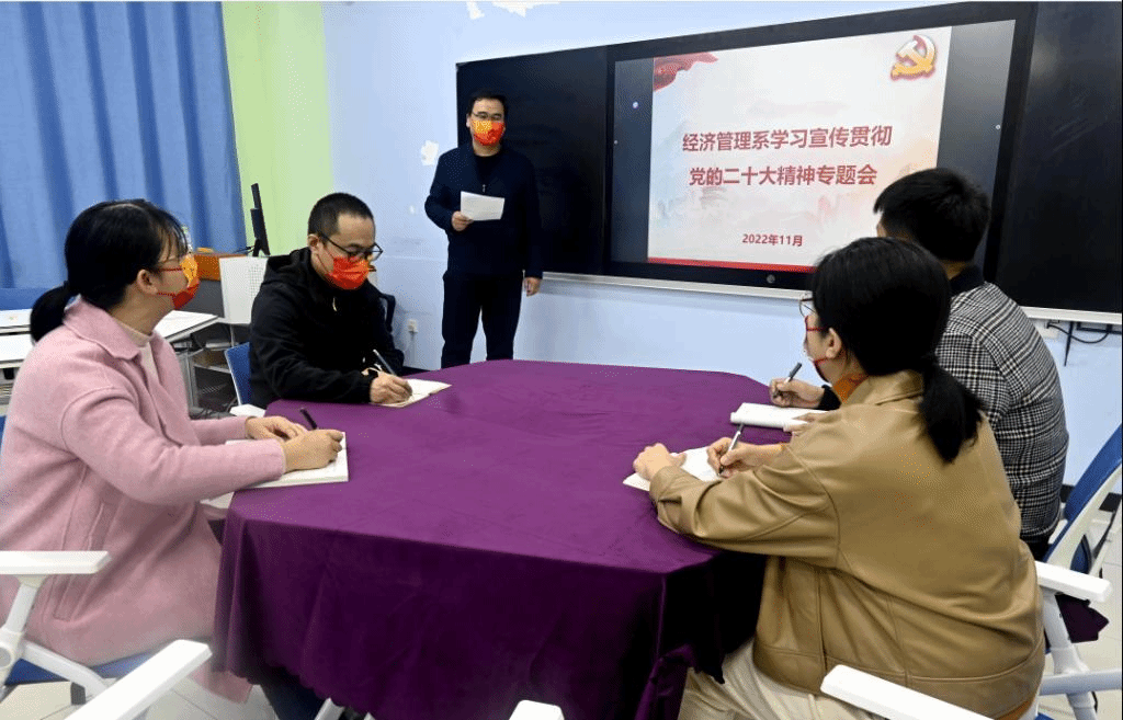 11月11日下午,经济管理系在1号教学楼召开学习宣传贯彻党的二十大精神专题会,系班子成员、各支部书记、全体党员教师参加会议,会议通过线上线下相结合的方式召开。