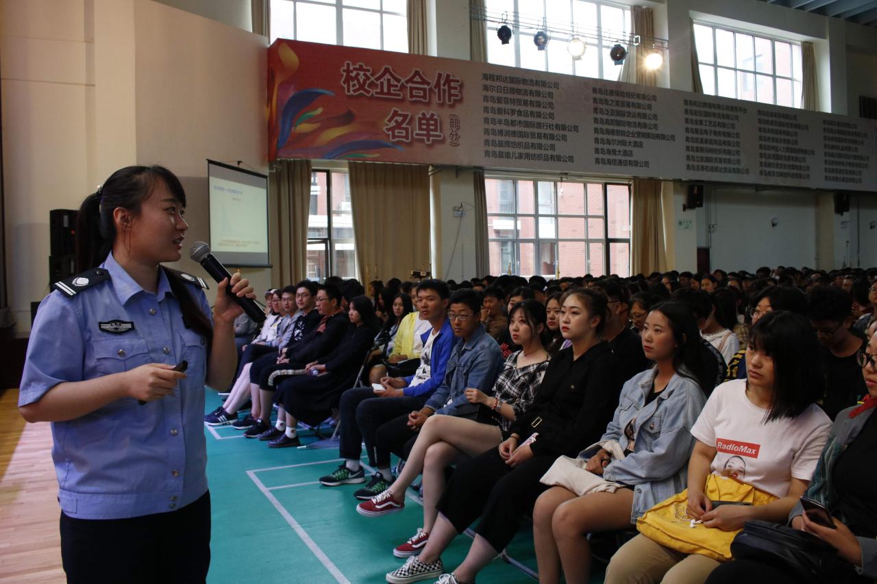本次系列讲座特邀请青岛市公安局刑警支队、青岛市反诈骗中心警官宋笛,青岛市财商教育委员会讲师、青岛市交通银行经理成玮,青岛市食品药品监督管理局李沧分局科长高大勇。三位专家分别从自己的专业角度给同学们进行了相关安全知识的讲解和剖析,在反诈骗讲座互动阶段中,有学生现身说法向其他同学们讲述了自己被诈骗份子欺骗的经历,在同学们中引起了较强烈的共鸣。