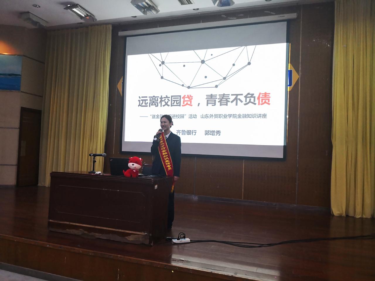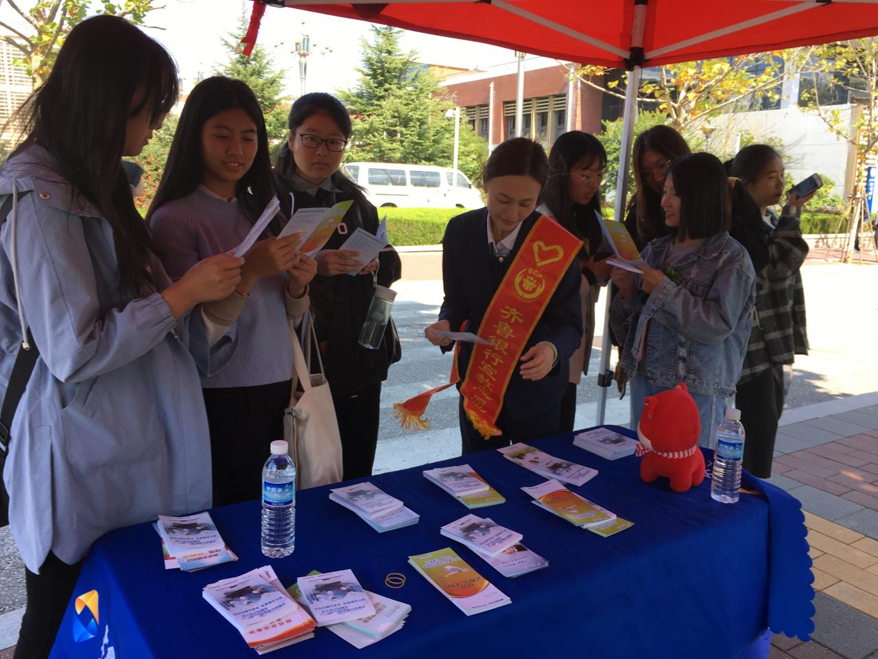 10月11日中午,由齐鲁银行、平安银行、中国银行、汇丰银行联合组织的16人的专业宣讲团队在校园内开展宣讲活动。宣讲团在校内设立的宣传摊点发放了金融风险提示的相关宣传材料,接受同学们对于银行业务方面相关咨询。活动吸引了同学们驻足参与,同学们对购物分期付、消费贷款风险等关心的问题进行提问,现场工作人员给予了耐心细致的解答。除了接受现场咨询,齐鲁银行青岛分行人员还精心准备了一场别开生面的“远离校园贷 青春不负债”主题讲座。消费者保护宣传讲师郭增秀通过引用实际诈骗案例,话题讨论、问题抢答等形式,为现场到400多名大学生详细讲解了非法“校园贷”的特征,并结合鲜活的事例进行分析,使同学们理解的更加透彻。