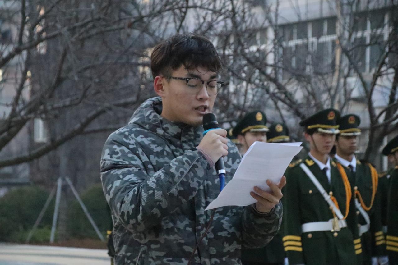 早上6:25分整,国旗护卫队准时从图书馆广场出发,一路迈着铿锵有利的步伐行至1号教学楼前,在《歌唱祖国》的雄壮歌声中正步走入场。随后,五星红旗伴着高亢激昂的《义勇军进行曲》缓缓升起,在清晨的曦光里迎风飘扬。“1999年12月20日零时,中华人民共和国国旗和中华人民共和国澳门特别行政区区旗在澳门文化中心花园馆升起,标志着澳门正式回归祖国怀抱。今年是澳门回归的第19个年头。百年的沧桑破碎已经一去不复返,曾经被分割被分裂的耻辱只能成为中华儿女精进的动力。”升旗仪式结束后,学生代表2017级电子商务三班李文琛同学在国旗下发表感言,呼吁同学们铭记历史,让五星红旗扎根心中,为实现中华民族伟大复兴而努力奋斗。