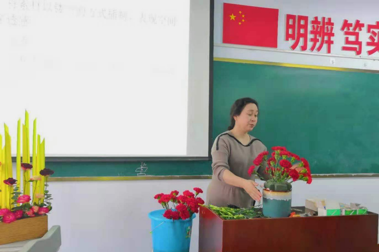 花艺讲座后,王韶燏对同学们进行了实践指导,她向同学们介绍了各种材料的名称及不同花的习性,讲解了插花过程中的注意事项,同学们分成四个小组,选择不同的花器,解读花语,各自命题,充分发挥自己的想象力,将杂乱无序的花枝变成了精美作品,王韶燏还悉心为每组学生的作品进行点评,针对难点示范操作。随后,同学们将花艺作品送至老师的办公室进行展示,并向老师们介绍花语及作品命题含义,获得了肯定和鼓励,成就感和自信心得到提升。
