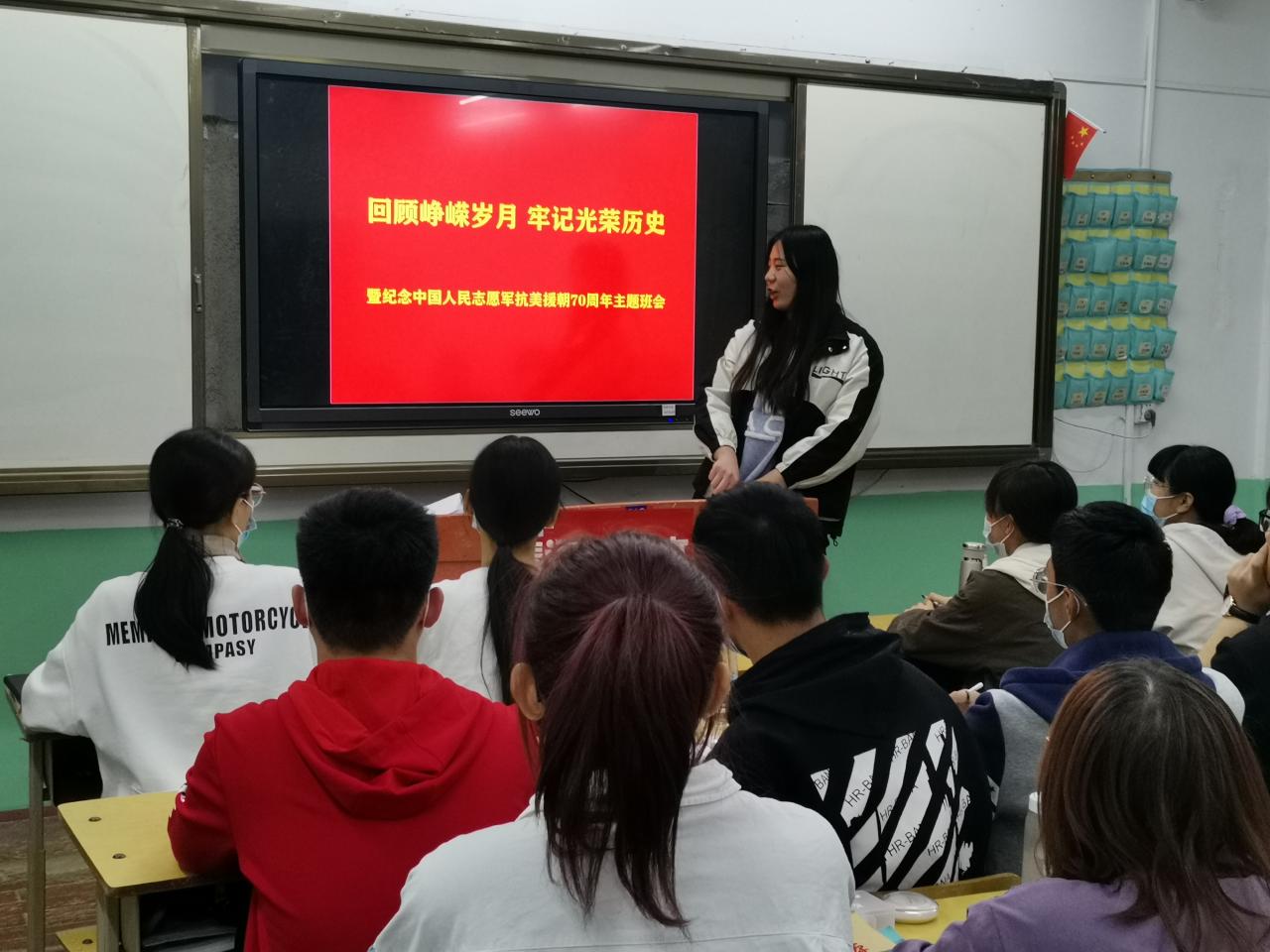 信息工程系2020级各班同学还以班级为单位,分别开展了“继承和弘扬抗美援朝精神”主题班会。在2020级软件3班的班会上,辅导员田俊洁老师以“回顾峥嵘岁月,牢记光荣历史”开场,详细讲述了抗美援朝战争的历史背景,中国人民志愿军浴血奋战的英勇事迹,列举了战争中涌现出来的典型人物,让同学们深入了解伟大的抗美援朝战争,是保卫和平、反抗侵略的正义之战。班会上,同学们还统一观看了系列纪录片《为了和平》。其他班级也通过观看影片、交流体会等多种形式组织主题班会,集体学习抗美援朝精神。