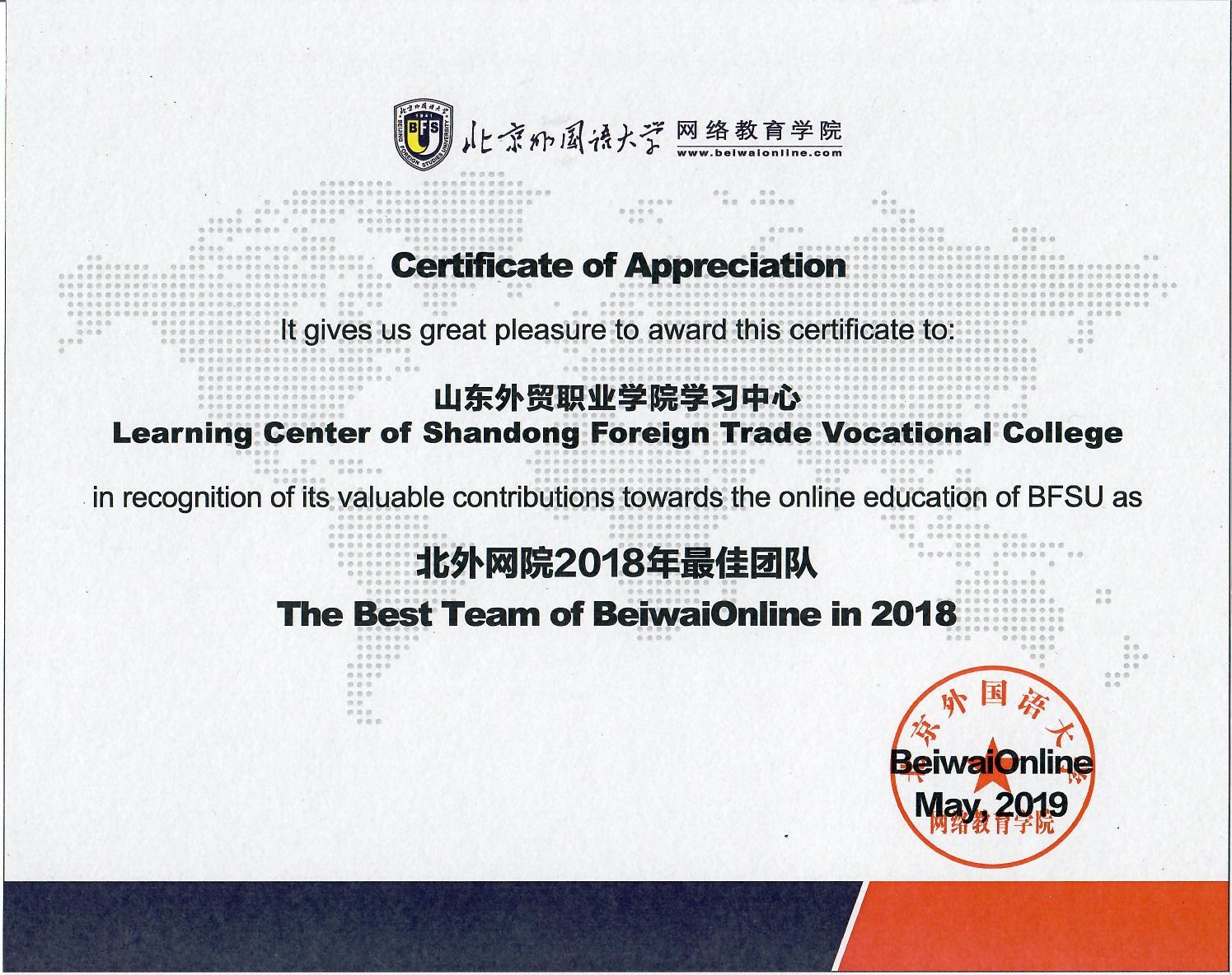 5月18日,第二届新时代网络教育内涵式发展论坛暨学习中心工作会议在北京召开。伟德学习中心荣获北外网院最佳团队奖。