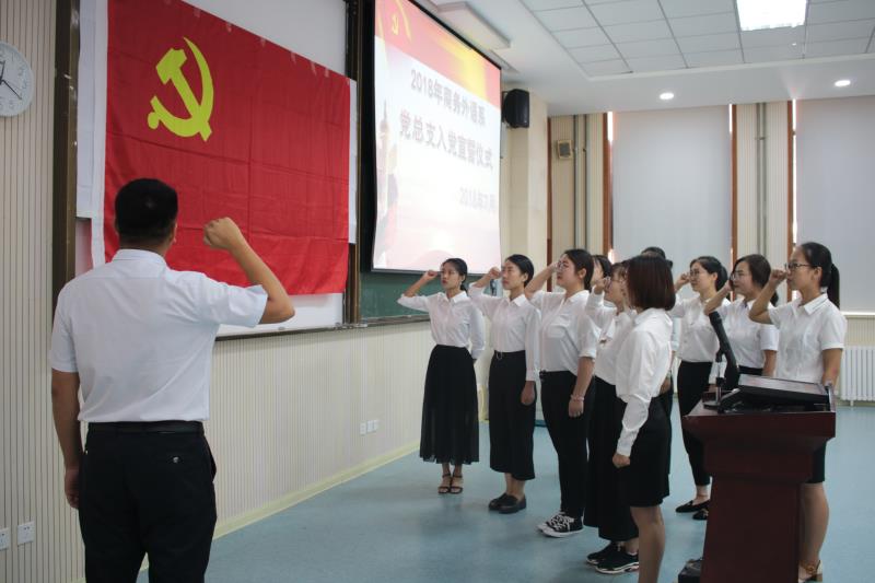7月6日下午,商务外语系党总支在B1教室举行了2018年入党宣誓仪式,总支全体新、老党员,部分入党积极分子代表参加了宣誓仪式,商外系党总支书记贾贵贞同志主持仪式,学院党委委员、副院长周厚才出席并致辞。