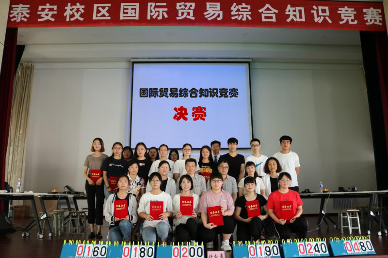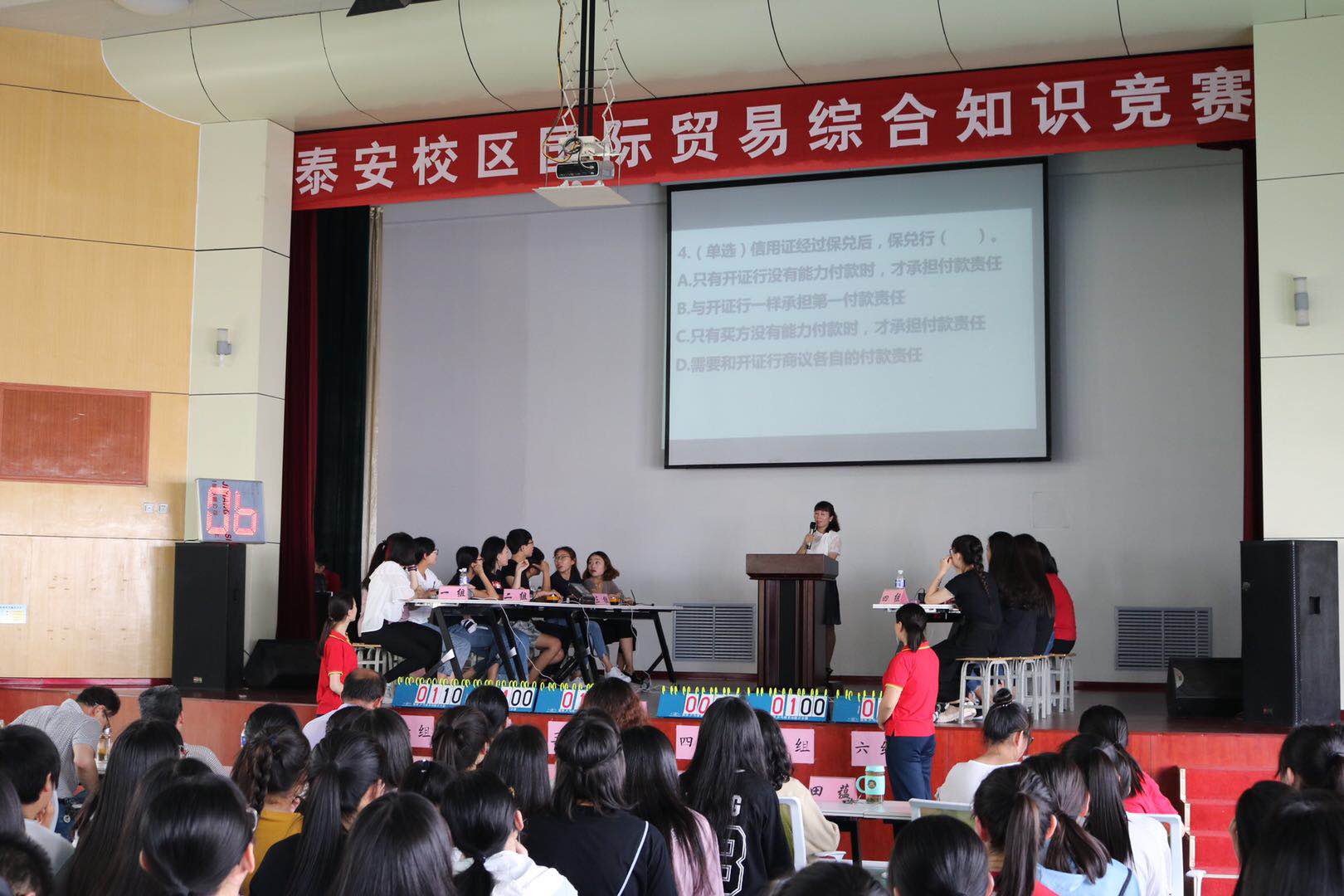 5月17日,泰安校区国际贸易综合知识竞赛决赛在校区礼堂举行。经过初赛决出的18位参赛选手自由组合成4组,采用抢答和必答的方式进行决赛。