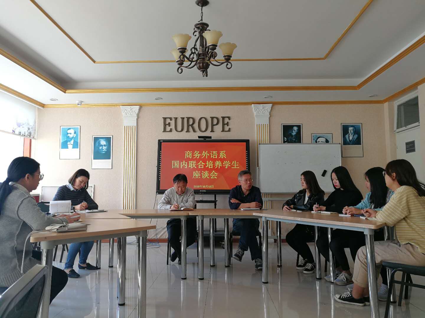 10月19日下午,商务外语系在外语村欧洲村举办国内联合培养学生座谈会。商务外语系党总支书记贾贵贞、主任王应喜、副主任于晶晶出席座谈会,广东外语艺术职业学院及广东工贸职业技术学院来伟德学习的3名学生、与他们“结对子”的3名同学及辅导员老师参加了座谈会。