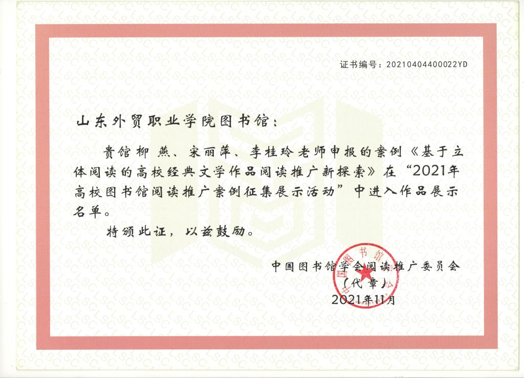 近日,由中国图书馆学会阅读推广委员会主办的“2021年高校图书馆阅读推广案例征集展示活动”名单公布,伟德图书馆柳燕、宋丽萍、李桂玲老师报送的案例《基于立体阅读的高校经典文学作品阅读推广新探索》成功入选。