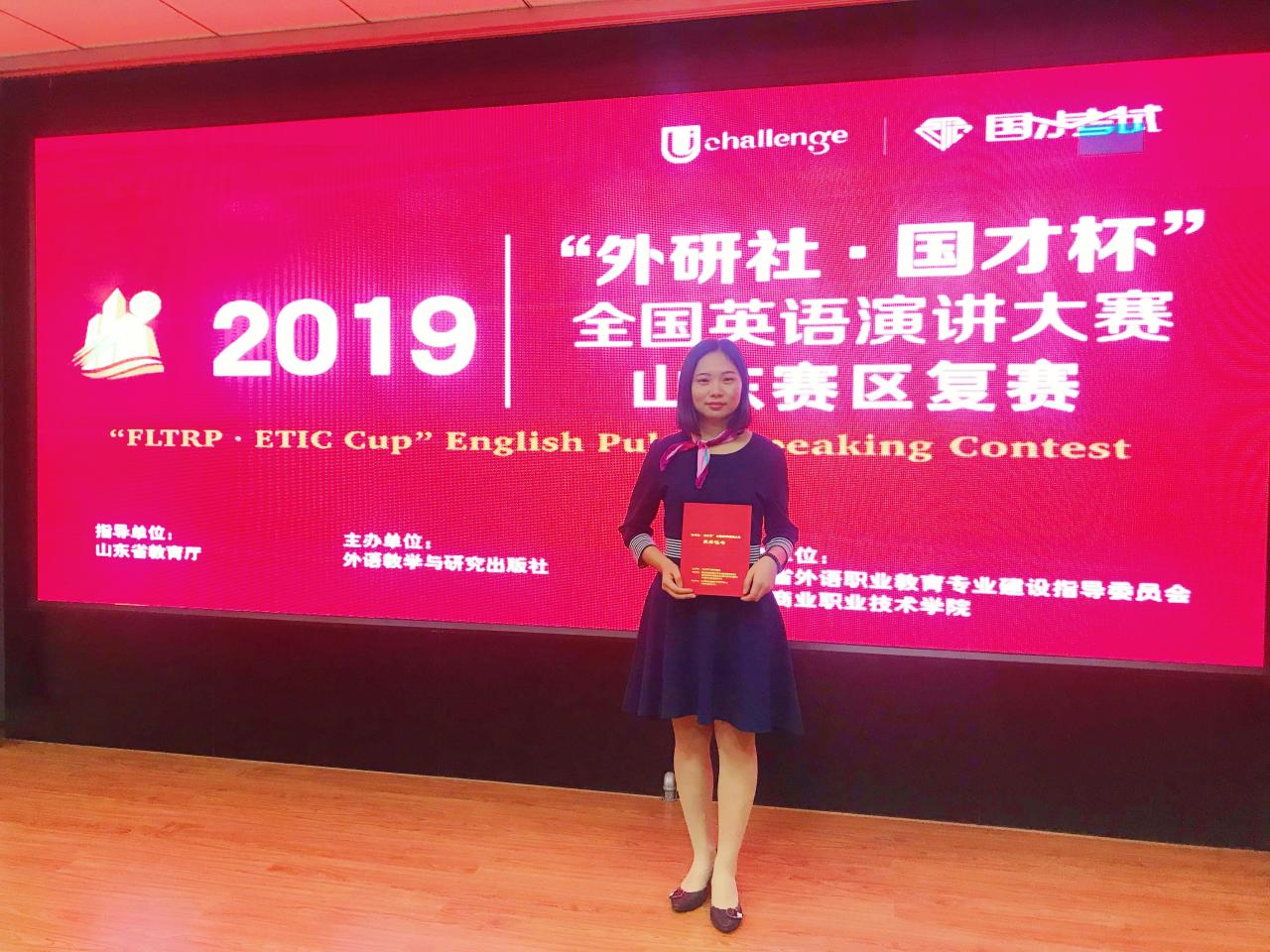 本届大赛由山东省教育厅指导、外语教学与研究出版社主办,山东省外语职业教育专业建设委员会和山东商业职业技术学院承办。比赛参照全国英语演讲大赛的评分标准,分为定题演讲和即兴演讲两个环节,综合考察选手的英语应用能力、语言应变能力和综合能力等。于婷婷在今年6月公共英语部举办的英语演讲比赛决赛中,获得了第一名的好成绩,并代表学院参加了山东赛区复赛,最终她凭借流利的口语表达能力、机敏的语言思辨能力在众多选手中脱颖而出,获得了一等奖,为学院争得了荣誉。