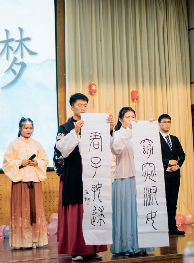 此次展演包含了民族乐器合奏、相声、汉服展示、戏曲、小品等多种中国传统文化艺术表演形式。整场演出在清雅乐团表演的民族器乐合奏中缓缓拉开序幕。笑源曲艺社同学为观众带来了相声《三娘教子》,两位表演者妙语连珠,逗得台下观众哈哈大笑。随后登台的是身着汉服的汉服社社员,他们通过精心编排的礼仪示范、舞蹈等表演向观众们展示了我国传统服饰的魅力。曲艺社一曲《盛世梨园美》带领观众重温经典唱段,感受传统歌唱形式的魅力。随后,莫名文学社和飘雪书画社联合带来朗诵书法结合表演《廊桥旧梦》,在清朗的诗词声中,两幅书法作品慢慢展现在观众眼前。