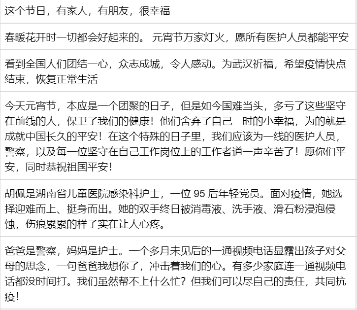 在亿万人民宅家、举国对抗疫情的特殊日子,值元宵佳节期间组织“特殊元宵节感受线上分享”活动,抒发同学们的思想情怀,凝聚大家的抗疫力量。