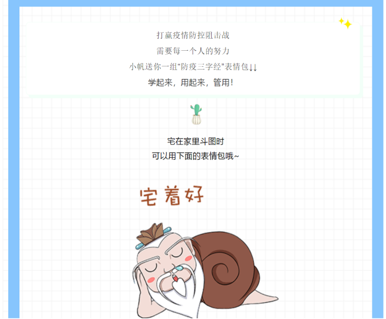 用“防疫三字经表情包”科普疫情防控知识,结合网络“热搜话题”设计暖心提醒漫画问答,提高同学们的抗疫能量储备,同时缓解长期居家的心理压力和不良情绪。