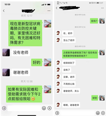 辅导员利用电话、微信等方式一对一与家庭经济困难等特殊群体学生沟通,做好思想疏导工作,给予人文关怀。