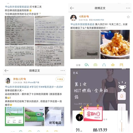 利用活动载体,做好思想引导。组织开展了“成长与感悟”疫情居家打卡活动,号召全体同学“宅”在家中也要“撸起袖子加油干”,克服心理懒惰,加强体育锻炼。