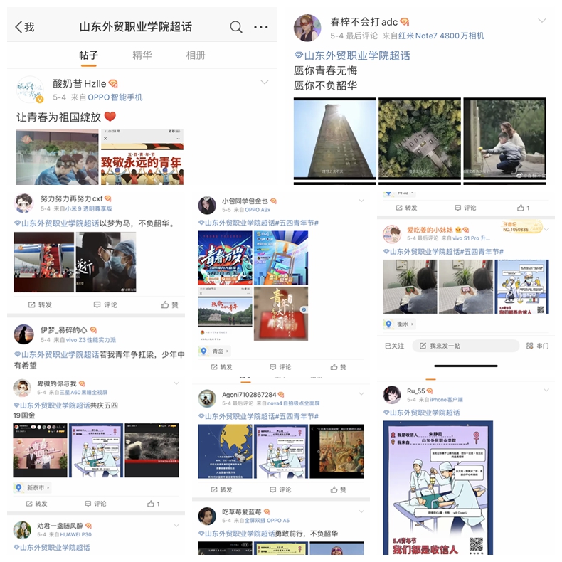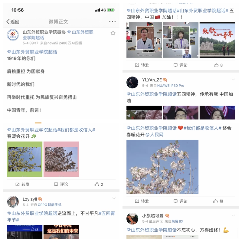5月4日当天,院团委依托微博、微信等多个网络平台开放专题活动,引导青年学生了解历史、关注当下,汇聚力量,共筑中国梦。在微博上,院团委开展“我的五四青年节”微信微博专题庆祝活动。活动设置了五四运动101周年专题、践行社会主义核心价值观专题和《我们都是收信人》专栏,伟德团员青年积极参与,通过手机拍照的形式,将自己庆祝“五四青年节”的方式拍下并上传至纪念活动专题,也有的同学围绕总书记的“青春三问”以“收信人”的身份,在“超话”中留言,写下自己的答案。在微信平台上,院团委制作了纪念活动微信推送,推介了《致敬永远的青春》等主题经典影视作品供同学们观看。此外,在活动当天,院团委集中组织了伟德团员青年参与共青团中央举办的“让青春为祖国绽放”网上主题团日活动。该活动以学习宣传贯彻习近平总书记关于青年工作的重要思想为主线,按照“出彩青春”“战疫青春”“奋斗青春”“绽放青春”四个篇章,集中讲述广大青年踊跃投身疫情防控、复工复产的生动故事,让伟德团员青年在活动中感受到新时代青年爱国担当、奋发向上的精神风貌。