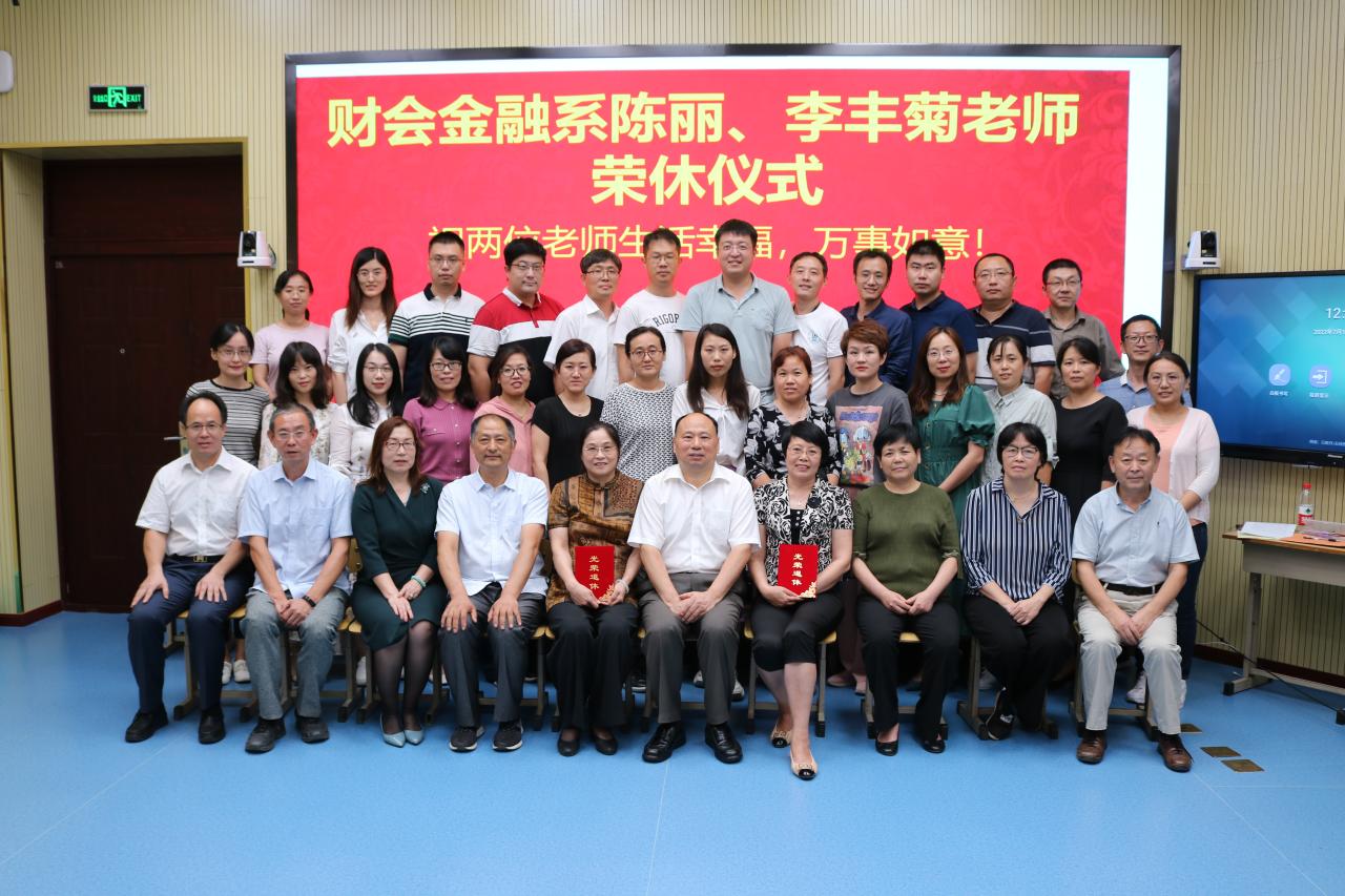 唐长臣、姜学初为陈丽颁发了荣休证书和纪念章,宋丽萍、韩淑君、贾贵贞为李丰菊颁发了荣休证书和纪念章。两位老师分别发表了荣休感言,感谢学院领导的关心和支持、感谢财会金融系这个和谐的大家庭,祝福大家以后工作顺利、家庭幸福。唐长臣致辞,他充分肯定了两位老师对学院建设做出的巨大贡献,对她们多年来的奉献表示由衷的感谢,也希望她们尽快完成角色转换,回归家庭,享受天伦之乐。最后,在《常回家看看》的音乐声中,全体与会人员合影留念。