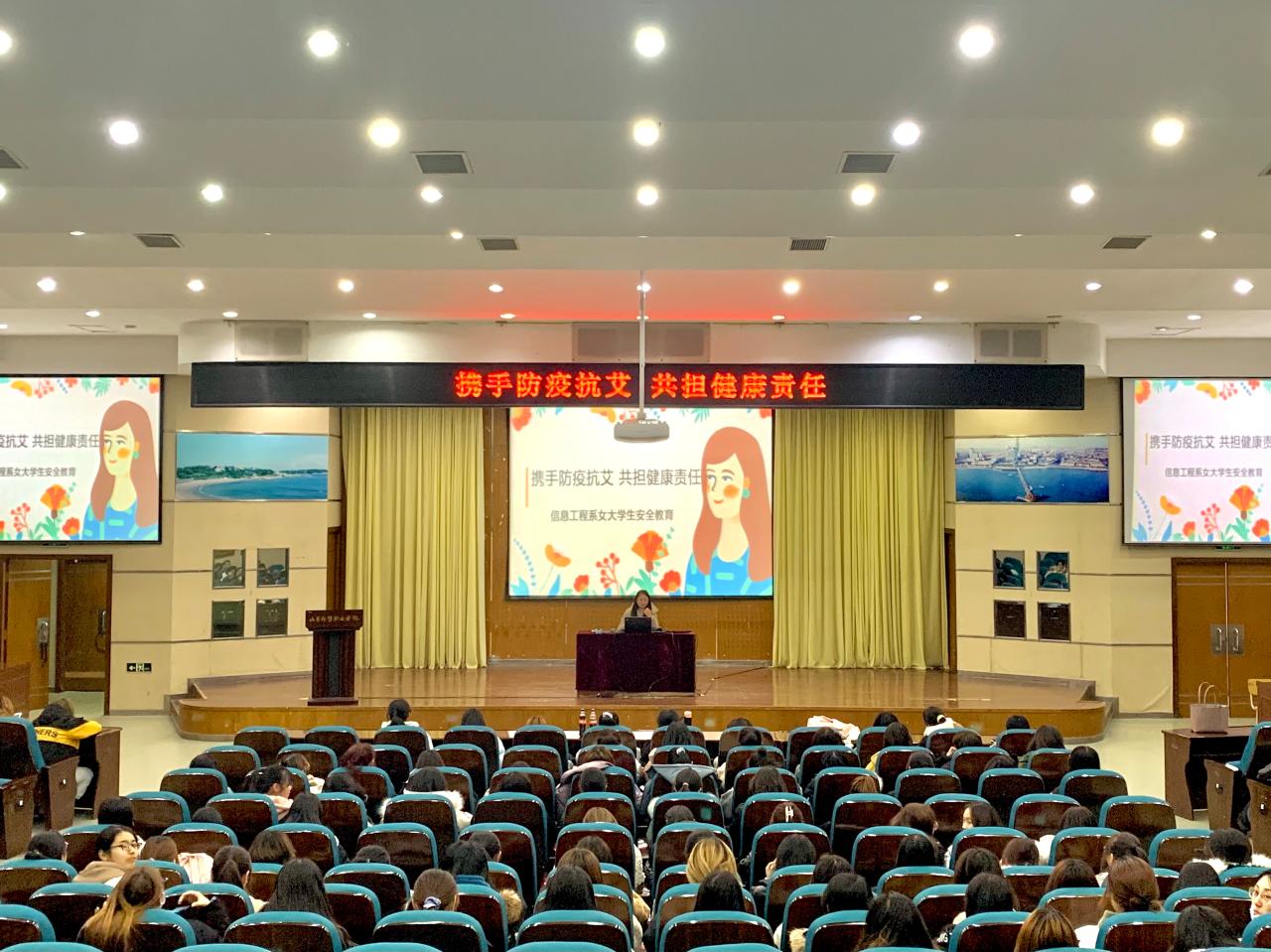 12月1日,信息工程系在学术报告厅举办以“携手防疫抗艾、共担健康责任”为主题的女大学生安全教育讲座。信息工程系辅导员王俊力担任主讲,信息工程系全体女生聆听讲座。