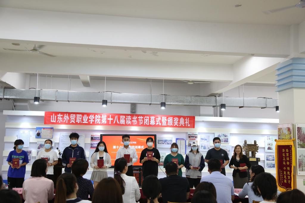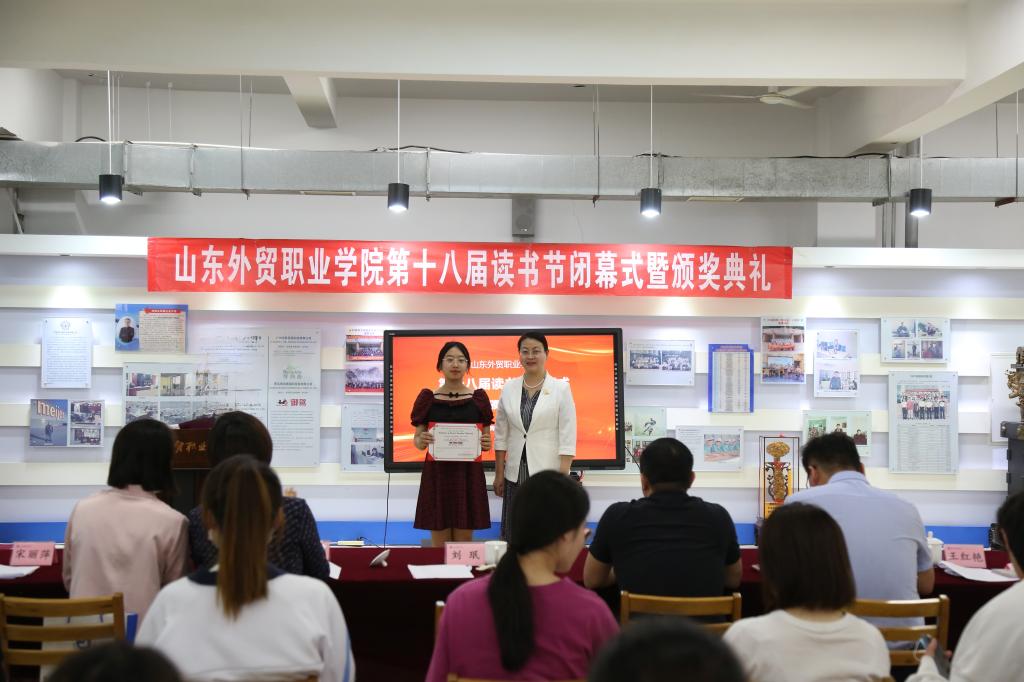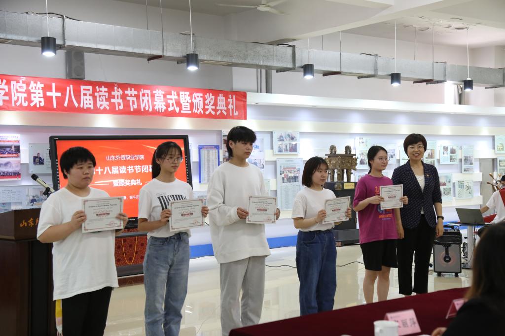 图书馆阅读推广部负责人孙晓凤宣读了本届读书节活动的获奖人员名单,出席闭幕式的领导和嘉宾为部分竞赛活动获奖者和阅读之星颁发获奖证书,“阅读之星”代表、国际贸易系学生李国柱在现场分享了他的阅读经历和感受。