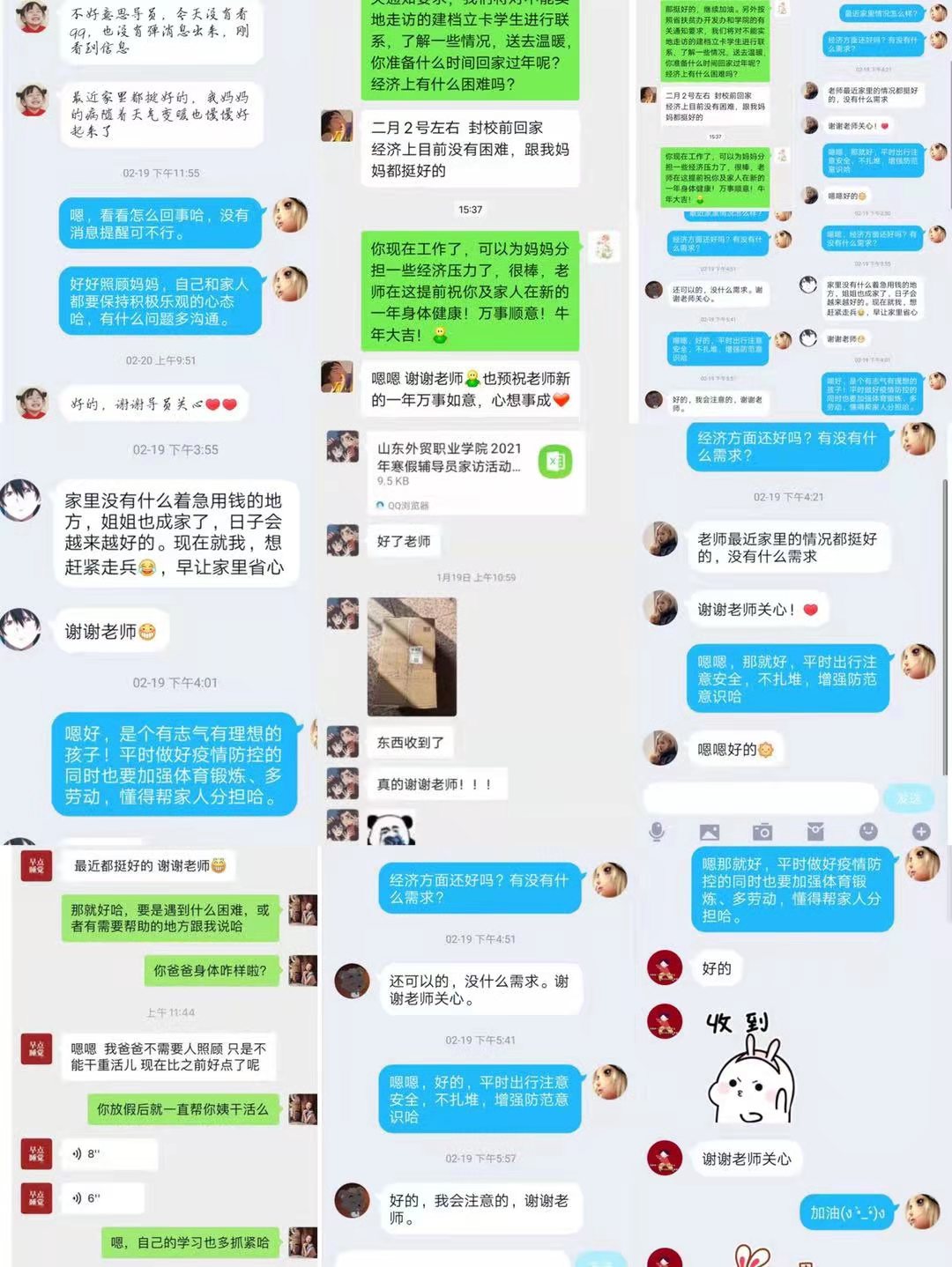 近年来,学院坚持寒假学生走访制度,成立学生走访工作小组,走访学生涉及建档立卡、孤儿、学业困难、心理困难等不同层面,让同学们更多地感受到学院的关爱和温暖。