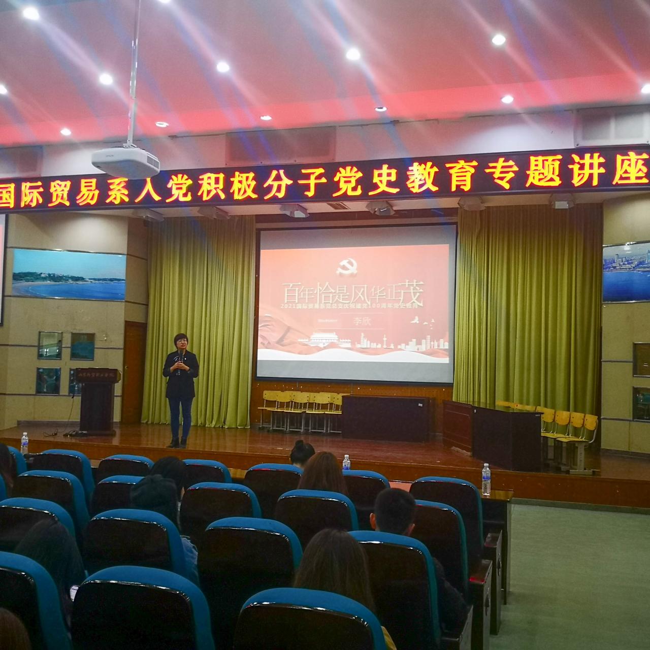 为认真贯彻习近平总书记在党史学习教育动员大会上的讲话精神,加强对大学生入党积极分子培养教育,4月1日下午,国际贸易系入党积极分子党史教育专题讲座第一讲在学术报告厅举行,国际贸易系党总支书记李欣以“百年恰是风华正茂”为主题进行了专门授课,2019级入党积极分子及全体辅导员参加了此次讲座。
