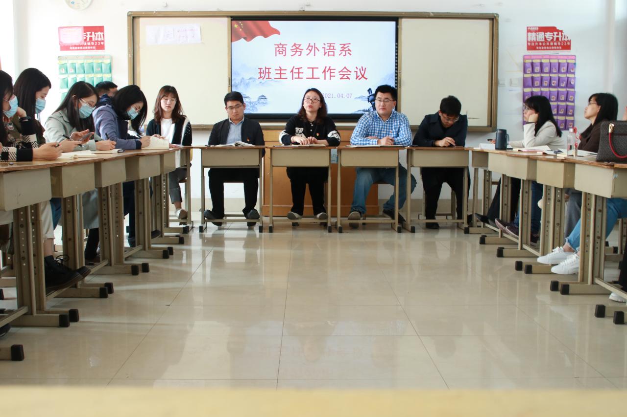 为进一步加强学风建设,提升班级学生管理工作水平,4月7日,商务外语系在2号教学楼B407教室召开班主任工作会议。系党总支书记刘永美、副主任兼学工办主任谭晓栋,19、20级班主任及辅导员参加了会议。