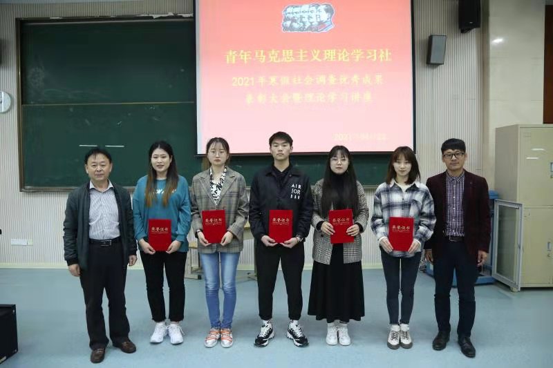 4月22日,青年马克思主义理论学习社(以下简称“青马社”)在2号教学楼A2阶梯教室举行2021年寒假社会调查优秀成果表彰大会。思想政治理论教学部党总支书记贾贵贞、主任季洪辉及全体指导教师出席,青马社全体社员参加。