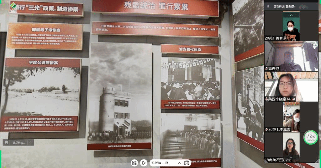 师生们通过“青岛英烈网”进入网上纪念馆入口,“山河魂”烈士群雕的全景图像映入眼帘,跟随页面上的导览光标,“走向”这座群雕,仿佛真正站在雕塑脚下,置身于纪念馆庄严肃穆的氛围之中。在烈士群雕像前,参加人员在线向烈士进行献花、默哀,通过云端向烈士们表达敬意、寄托哀思。随后,通过VR技术,全体活动成员共同“云”参观了青岛市革命烈士纪念馆,并收听解说,身临其境地学习烈士事迹、感悟英烈精神。