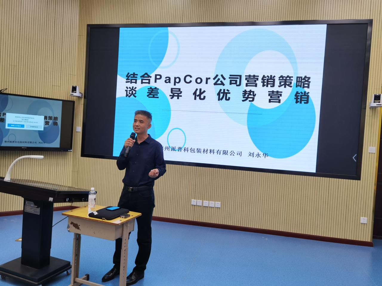 5月25日下午,市场营销专业邀请德州派普科包装材料有限公司总经理刘永华在1号教学楼智慧教室举办了“结合PapCor公司营销策略,谈差异化优势营销”的专题讲座,20级市场营销专业学生和部分老师听取的讲座。