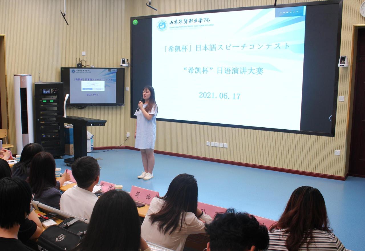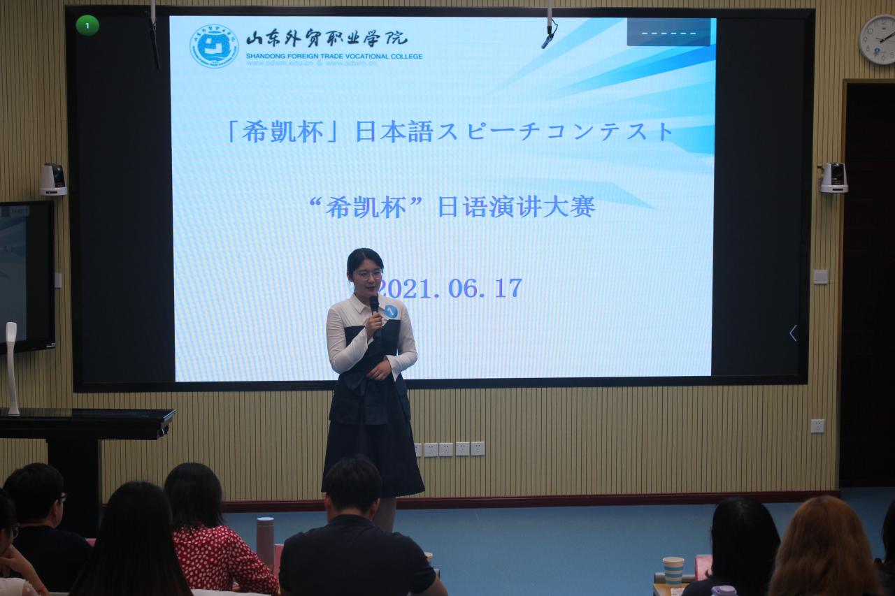 6月17日下午,由商务外语系主办,青岛希凯国际贸易有限公司冠名的首届“希凯杯”日语演讲比赛在一号教学楼第四阶梯教室成功举办。青岛希凯国际贸易有限公司总经理薛锋、人事经理孙彦、业务主管滕欢,商务外语系党总支书记刘永美以及商务日语教研室的老师们担任此次比赛的评委,公司冠名班级20级商务日语一班学生及其他日语班学生代表观摩了比赛。