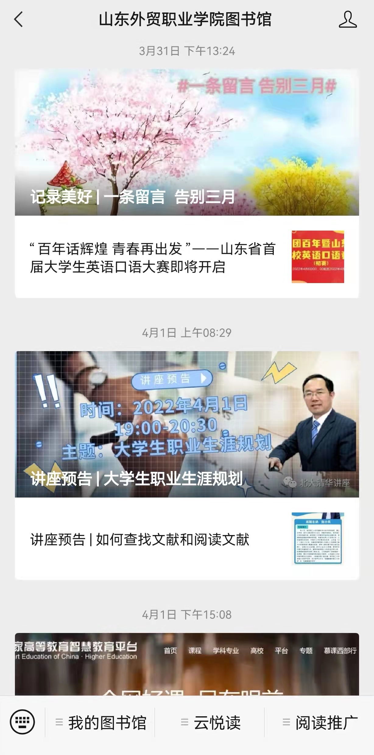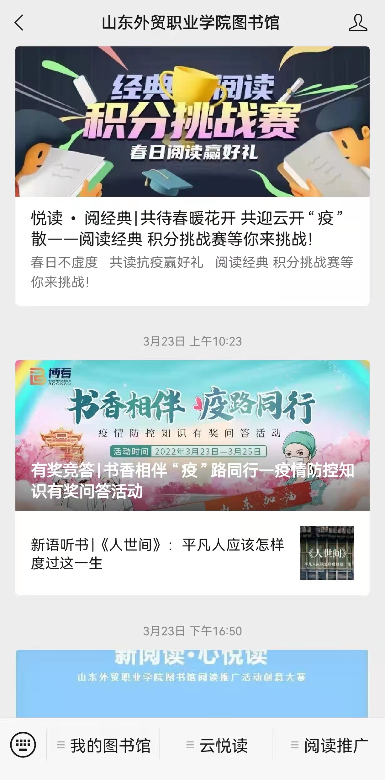 疫情期间,图书馆积极策划开展各类线上阅读推广活动,通过公众号推出新语听书有声图书系列,举办了“书香相伴‘疫"路同行——疫情防控知识有奖问答活动”、“共待春暖花开 共迎云开‘疫"散——阅经典积分挑战赛、新阅读˙心悦读阅读推广活动创意大赛、“百年话辉煌 青春再出发”大学生英语口语大赛等线上活动,丰富了疫情期间大学生的精神文化生活。