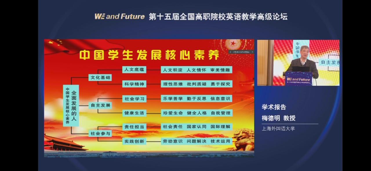 教育部职业院校外语类专业教学指导委员会副主任委员王志教授做了题为《中国职业教育与高职英语课标》的报告,详细介绍了新《课程标准》的内容、特点及修订过程。随后,上海外国语大学梅德明教授作了题为《英语课程的育人价值及实现路径》的报告。他强调人才培养以核心素养为中心内容,要着眼于文化基础,自主发展,要强调综合培养,强调文化意识、语言能力、思维品质和学习能力的结合。教育部职业技术教育中心研究所副所长曾天山教授在线上做了题为《“岗课赛证融通”培养高技能人才的实践探索》的报告。曾教授以三所职业院校为例,介绍了运用“岗课赛证融通”模式培养高技能人才的有益实践。