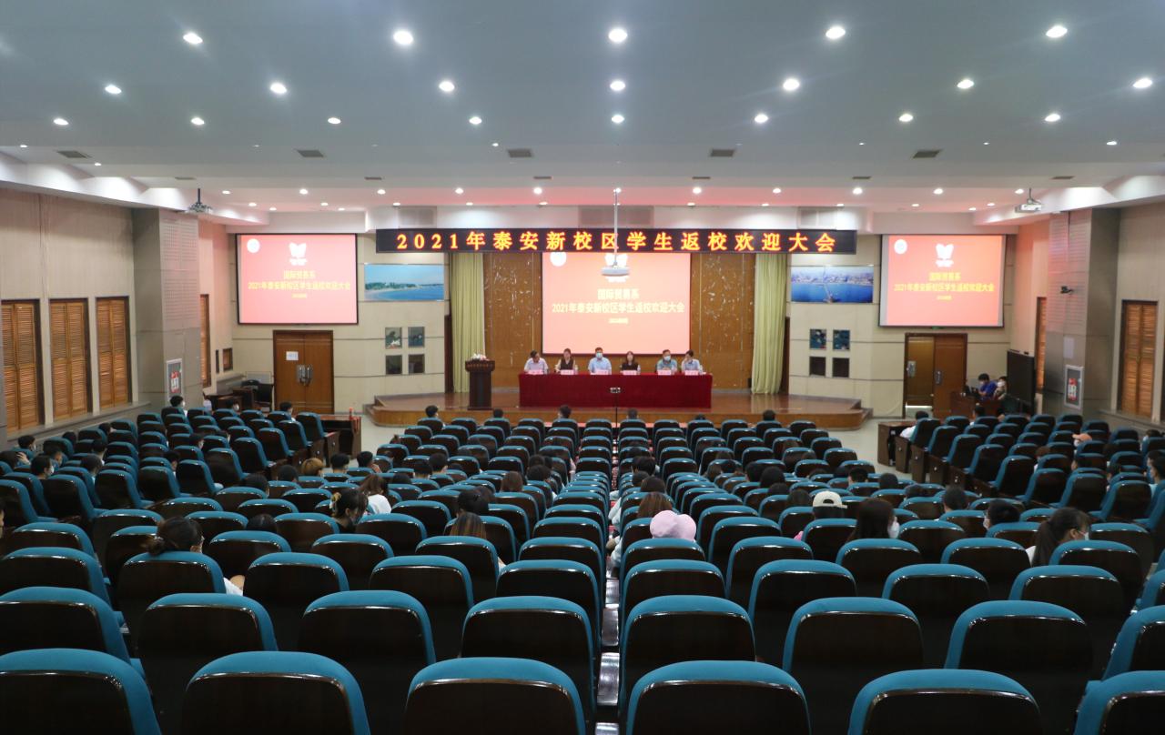 8月28日下午,国际贸易系在李沧校区学术报告厅举行2021泰安新校区学生返校欢迎大会。国际贸易系学工办主任王泓博、副主任孙智贤、班主任代表王立志,辅导员侯仁博、郑雅文,以及泰安新校区200余名学生参加了欢迎大会。会议由国际贸易系团总支书记桑伟主持。