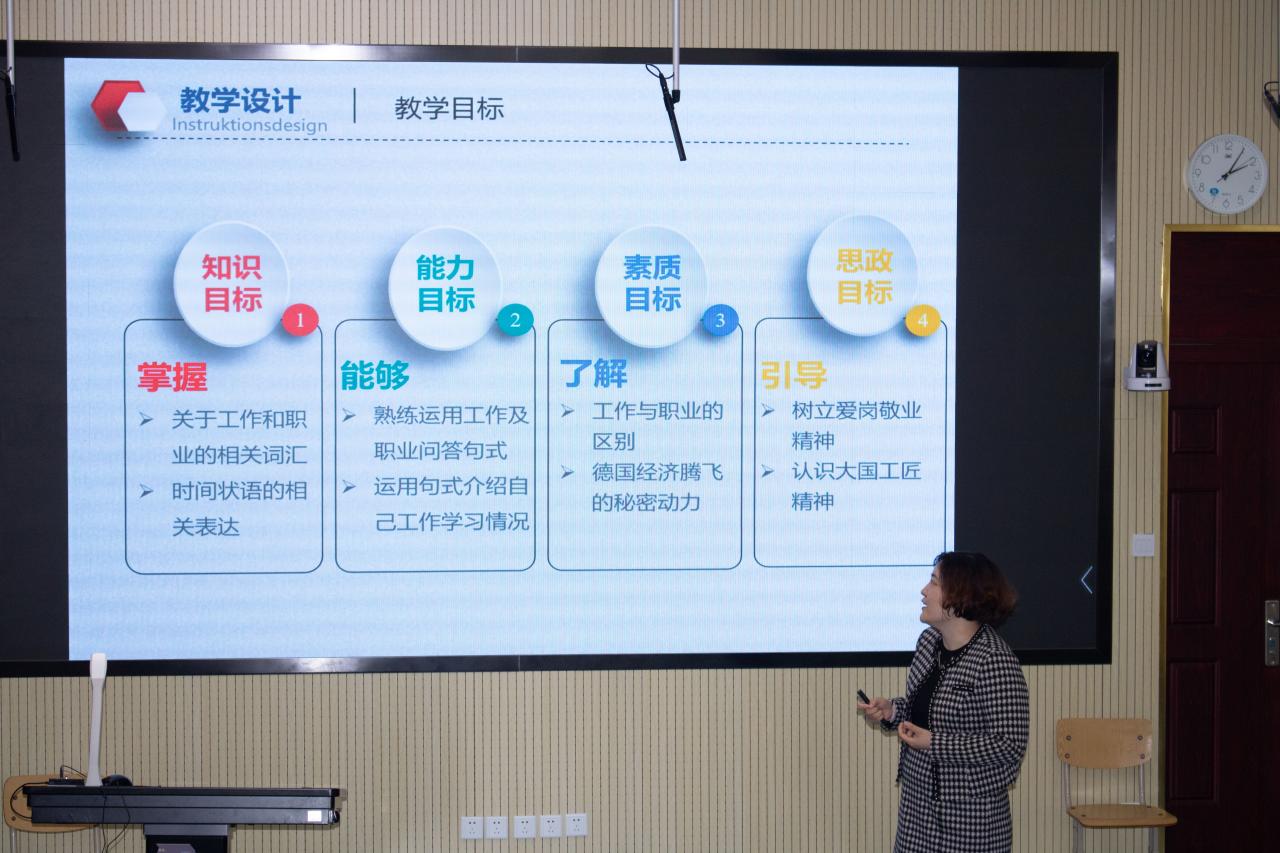 比赛分为讲述教学设计(5分钟)和模拟课堂授课(15分钟以内)两部分。参赛教师们准备充分,教学设计紧扣课程标准要求和职业场景需要,以学生为中心的设计理念贯穿始终;模拟授课环节中选手们充分利用多样化信息教学手段,同时巧妙地将思政元素融入课程之中,营造出热烈活跃的课堂气氛。最终,商务英语组穆婷婷、刘敏,其他语种组张霄凡、孙承辉脱颖而出,将代表商务外语系参加学院举办的青年教师教学比赛。