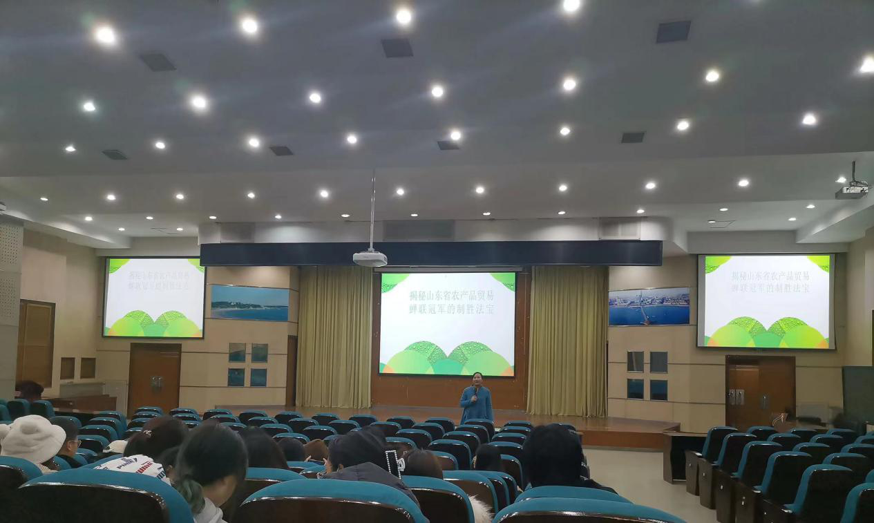 张秀华带领大家一起找寻山东省农产品贸易蝉联冠军的制胜法宝,从“山东主要出口什么农产品?”、“山东农产品贸易有多牛?”、“农业标准化是功臣“、“带你了解高标准农业什么样”这四个方面进行讲述。张 秀华讲到:”山东省农产品进出口贸易已经取得不错的成绩,总体上保持着较为快速稳定的增长速度,企业发展的势头也较为良好,呈现欣欣向荣的状态。“整场讲座贴近实际,条理清晰、深入浅出,加深了同学们对当今山东省农产品贸易情况的了解。