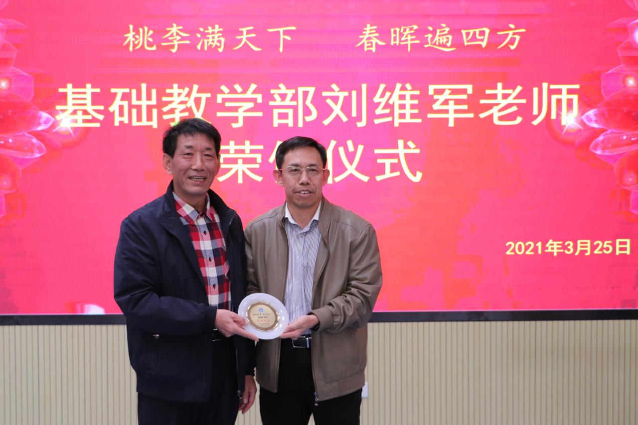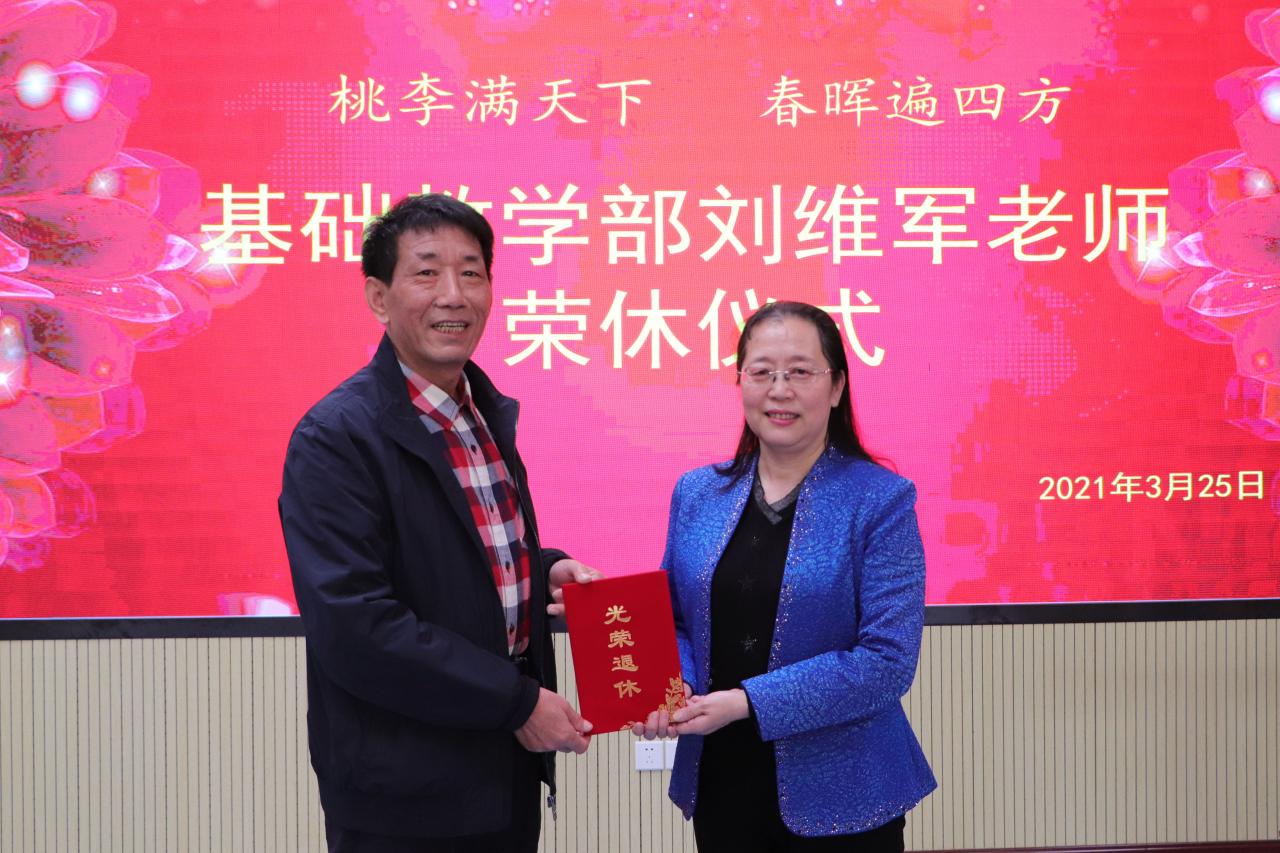 3月25日下午,基础教学部刘维军荣休仪式在1号教学楼第一阶梯教室举行。副院长程巍、工会主席张延伟、工会副主席宋丽萍、离退休干部处处长周新征、组织人事处副处长张清波、工会办公室主任冯锟、基础教学部党政领导及全体教师参加了仪式。荣休仪式由基础教学部副主任吴晓明主持。