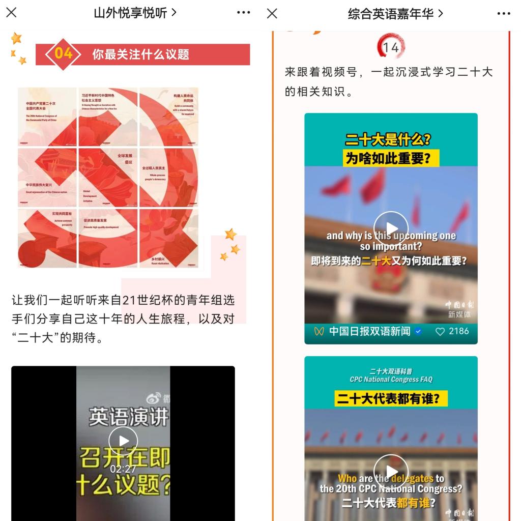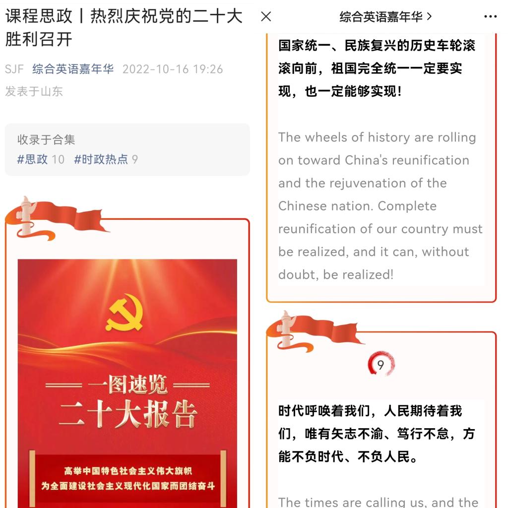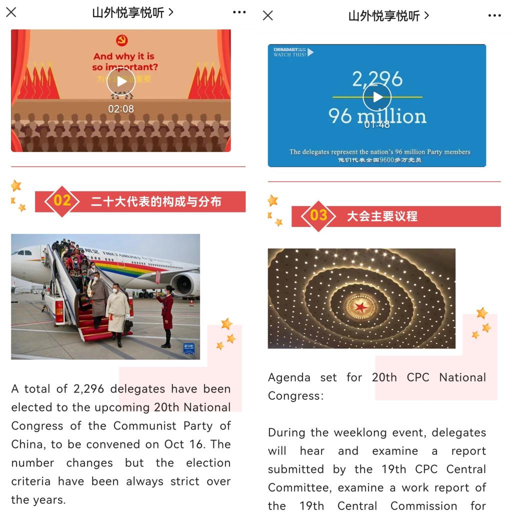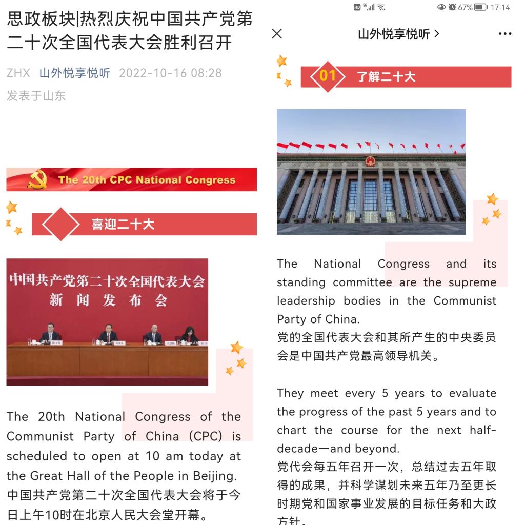 党的二十大召开当天,公共英语部组织全体教师收听收看并见证了这一伟大时刻,部门两个自建微信公众号“综合英语嘉年华”和“山外悦享悦听”相继推送了“课程思政|热烈庆祝党的二十大胜利召开”和“思政板块|热烈庆祝中国共产党第二十次全国代表大会胜利召开” 两篇文章。推文内容丰富,形式多样,涉及党的全国代表大会的英文词汇、代表构成与分布,以及习近平总书记讲话金句等中英双语版内容,转发了专家解读二十大报告的部分重要内容,引导学生全面了解党的代表大会,关注时事,厚植爱国情怀和民族自豪感,为学生提供更为便利的英语学习方式和有效途径。
