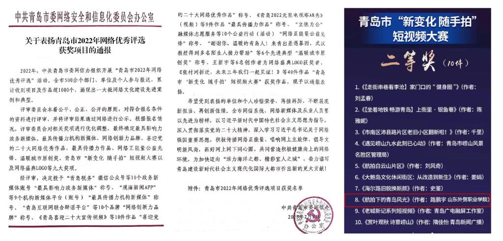 2月2日,2022年青岛网络盛典在青岛电视台举行,青岛市委常委、宣传部部长刘升勤出席活动。活动现场共颁出八大奖项,伟德商务外语系辅导员路鹏宇报送的作品《航拍下的青岛城市风光》荣获青岛市“新变化,随手拍”短视频大赛二等奖。