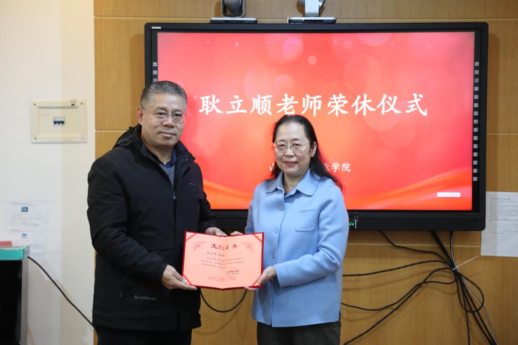 与会人员集体观看两位老师工作和生活回顾视频,深切感受两位老师为学院发展倾注的心血。程巍总结姜学初、耿立顺两位老师辛劳付出的教职生涯,充分肯定了他们为学院建设发展所做出的贡献,高度赞扬了他们敢于担当、甘于奉献的工作精神。她表示教职工荣休是学院一笔无形和无价的宝贵财富,体现了学院尊崇师道的文化理念,感谢为学院辛勤而无悔的付出与奉献,并表达了对他们的诚挚祝福和美好祝愿,希望年轻教职工将老教师的优良传统和宝贵经验传承和发扬光大。在座年轻教职工表示,将虚心学习老教师的奉献精神,将个人发展融于学院发展的潮流之中。随后学院领导及相关部门负责人代表学院分别为两位老师颁发和赠送了荣休证书、纪念章和纪念品。