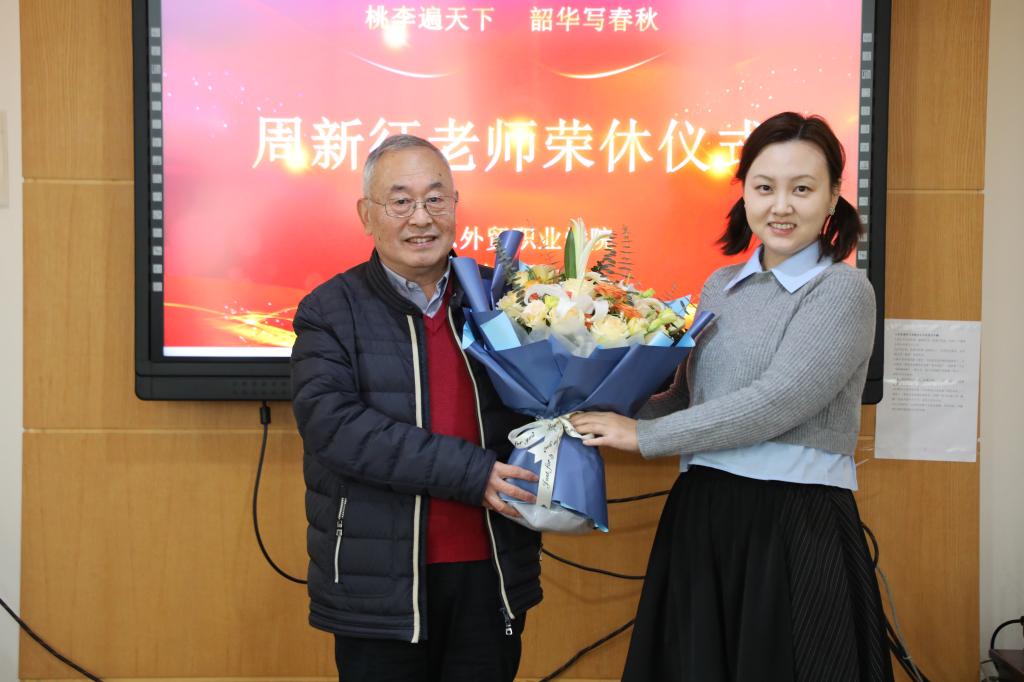 仪式上,程巍代表学院致辞,她表示教职工荣休是学院一笔无形和无价的宝贵财富,体现了学院尊崇师道的文化理念。感谢周新征老师41年来为学院、外贸系统的付出与奉献,特别是在学院离退休工作中,更是用心用情、精准服务,在平凡的岗位上创造出不平凡的业绩,深受离退休教职工喜爱。随后,程巍为周老师颁发荣休证书,机关党委专职副书记王何汉为周老师颁发荣休纪念章,工会副主席冯锟为周老师赠送荣休纪念品,团委刘婷婷为周老师献上鲜花并送上祝福,参加仪式的全体人员为周老师送上了最真挚的祝福。