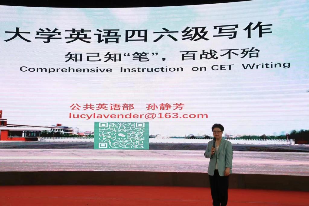5月10日,公共英语部孙静芳副教授在泰安校区泰山会堂以“Comprehensive Instruction on CET Writing(大学英语四六级写作——知己知‘笔’,百战不殆)”为题为泰安校区400余名学生讲授了四六级写作的技巧。她围绕大学英语四六级写作的重要性、题型、分值、评分标准,备考策略,从篇章结构入手,详细解析了段落写作技巧、措辞和句型结构,并结合2021年四级写作真题梳理了高分作文亮点,提出有效建议,推荐了相关书籍和线上资源。